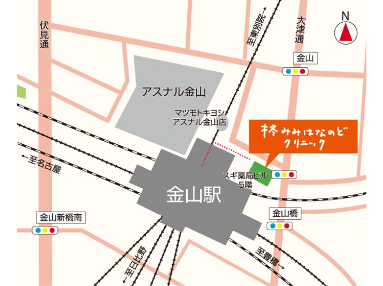 金山駅北口を出て、右方向の交番に進むとスギクリニックモール金山の最上階となる5階にあります。近隣の方はもちろん遠方の方でも通勤・通学途中に通っていただきやすい立地にございます。